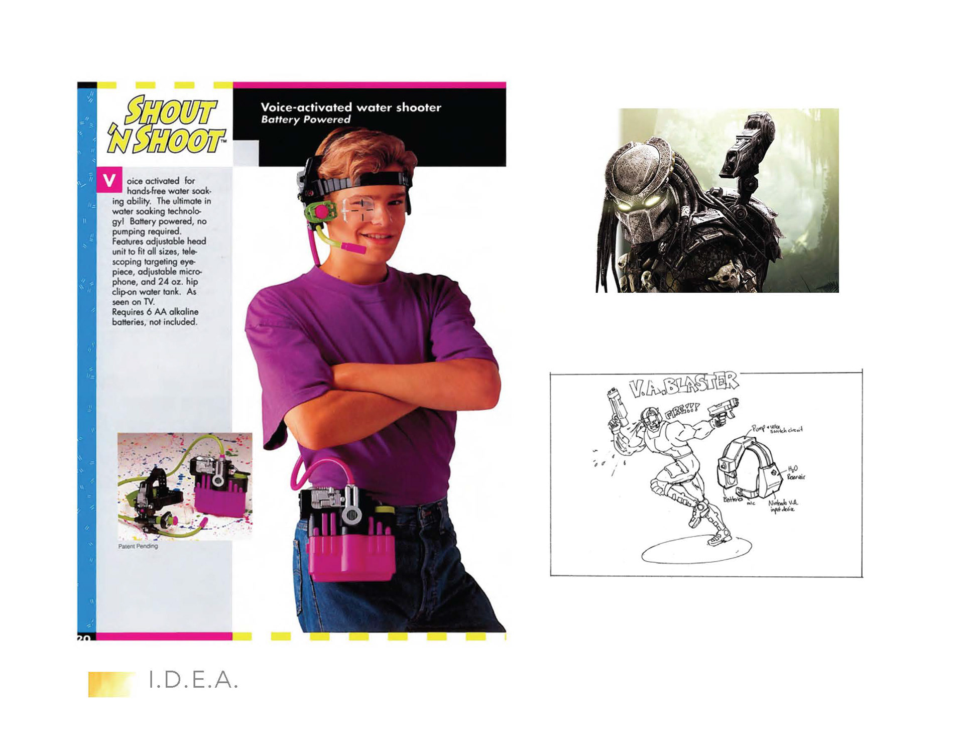 My first, placed inventor item - inspired by the shoulder-mounted weapon from the original Predator movie, I wanted a 'hands free' water blaster that would shoot anywhere my head was facing. The prototype was a sound-activated 'dancing flower' chip wired to an electronic pump and reservoir. The whole thing was packaged inside a Nintendo heads up video game controller. 'Captoy' bought the concept and wisely moved the reservoir to a belt mount.